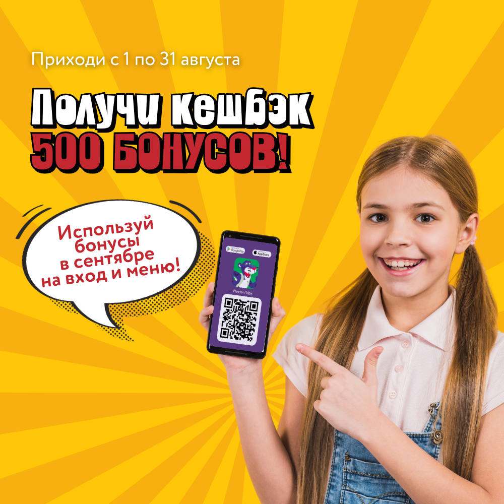 Дорогие др-р-рузья! Время ярких впечатлений и незабываемых моментов — и у меня есть для тебя отличная новость! С 1 по 31 августа 2025 года приходи в Мисти Парк и получай супер-кешбэк в нашем приложении! 🎉